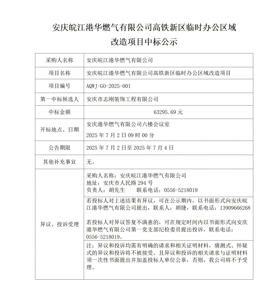 安慶皖江港華燃氣有限公司高鐵新區(qū)臨時辦公區(qū)域改造項目中標公示