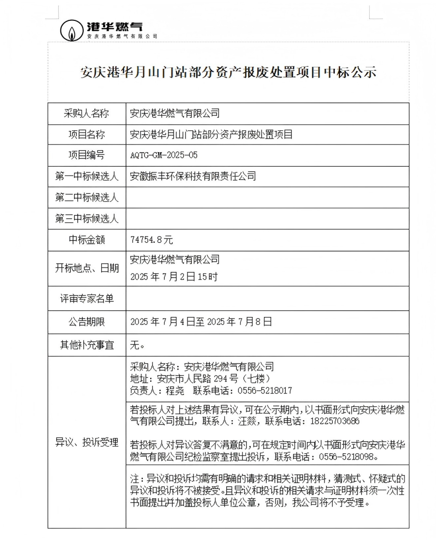 安慶港華月山門站部分資產(chǎn)報廢處置項目中標公示