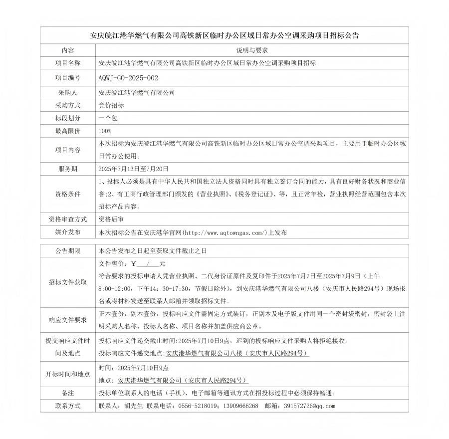 安慶皖江港華燃?xì)庥邢薰靖哞F新區(qū)臨時(shí)辦公區(qū)域日常辦公空調(diào)采購項(xiàng)目招標(biāo)公告