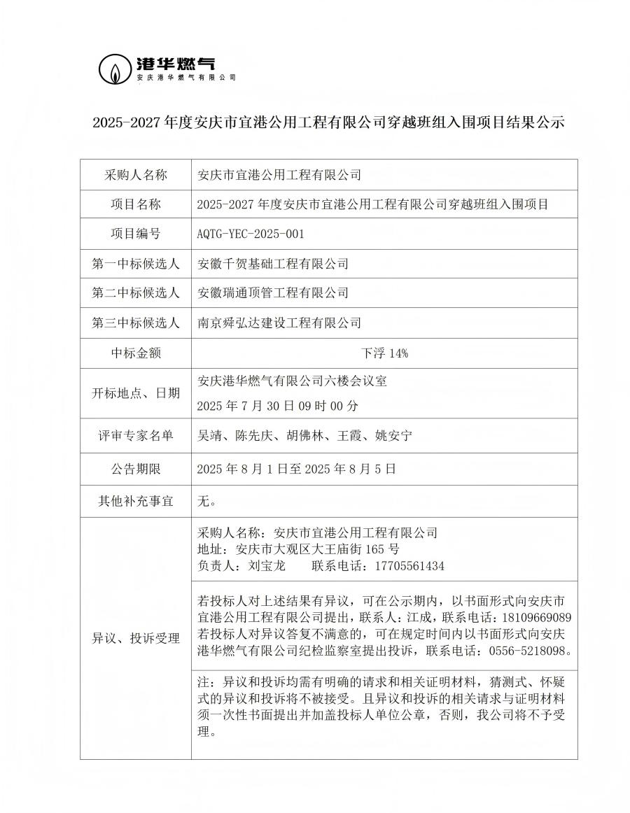 2025-2027年度安慶市宜港公用工程有限公司穿越班組入圍項(xiàng)目結(jié)果公示