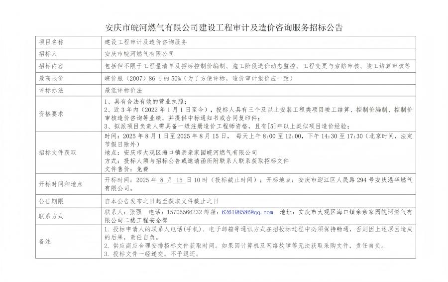 安慶市皖河燃?xì)庥邢薰窘ㄔO(shè)工程審計及造價咨詢服務(wù)招標(biāo)公告